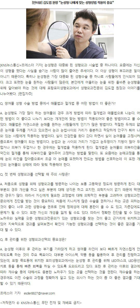 [인터뷰] 김도엽 원장 "눈성형 나에게 맞는 성형방법 적용이 중요" 페이지 정보 작성자 포미성형외과 작성일18-03-12 09:22 조회2,395회 댓글0건 관련링크 이전글 다음글 목록 본문 - 댓글목록 등록된 댓글이 없습니다. 이전글 다음글 목록