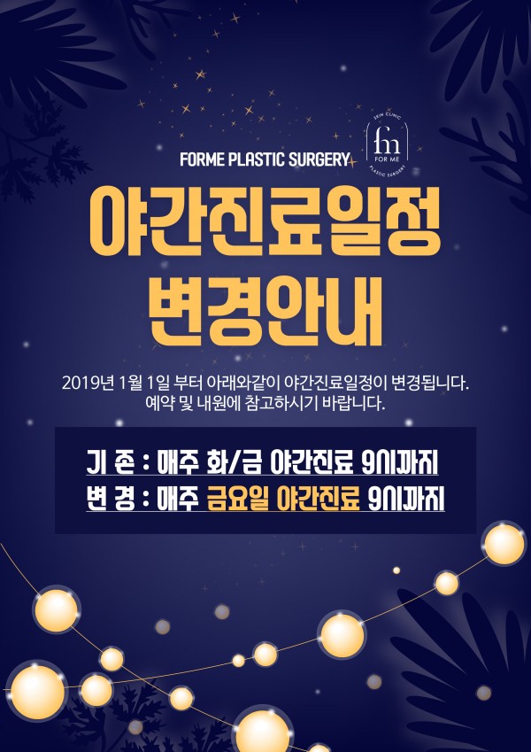 야간진료일정변경을 안내해드립니다. 페이지 정보 작성자 포미성형외과 작성일19-01-03 10:51 조회2,553회 댓글0건 관련링크 이전글 다음글 목록 본문 야간진료일정변경을 안내해드립니다. 예약 및 내원에 참고하시길 바랍니다. 이전글 다음글 목록