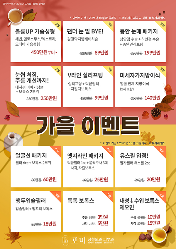 포미 9,10월 이벤트1 페이지 정보 작성자 포미성형외과 작성일21-09-01 15:45 조회3,421회 관련링크 이전글 다음글 목록 답변 본문 포미 9,10월 이벤트1 이전글 다음글 목록 답변