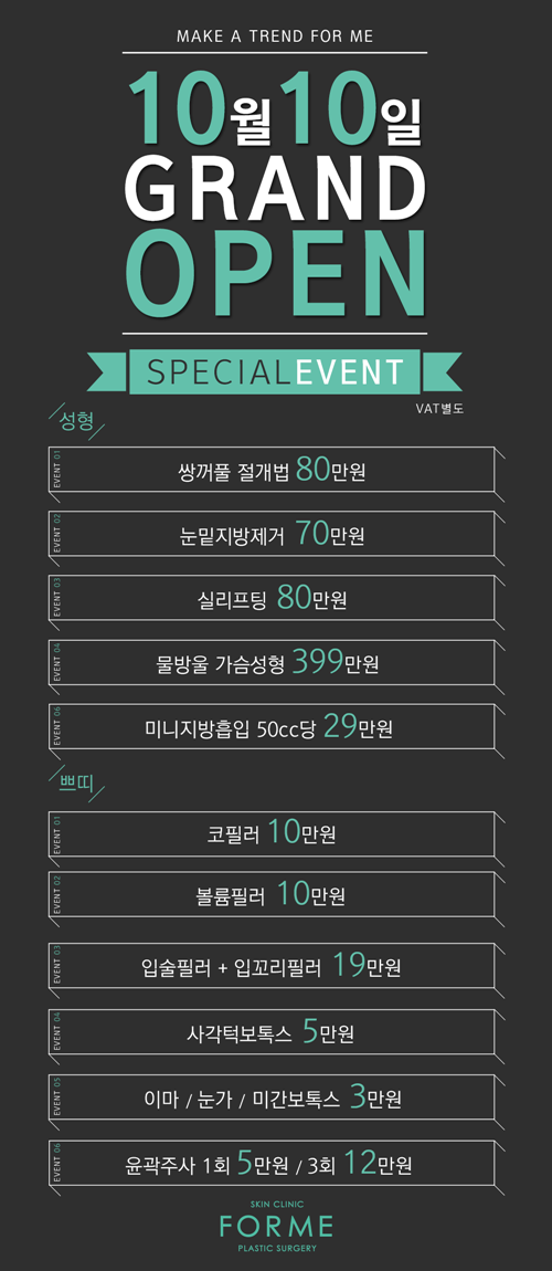 포미성형외과 10월 10일 오픈 이벤트 안내드립니다. 페이지 정보 작성자 최고관리자 작성일17-10-21 12:22 조회2,424회 관련링크 이전글 목록 답변 본문 포미성형외과 10월 10일 오픈 이벤트 안내드립니다. 054-273-0052 이전글 목록 답변